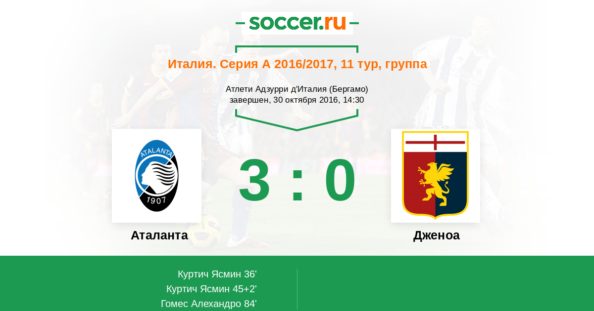 Эсекиль Муньос (Дженоа) высоко выпрыгнул в штрафной, чтобы головой нанести удар после отличной подачи. Удар оказался неточным, мимо правой штанги. Мяч покинул пределы поля. Аталанта введет мяч в игру ударом от ворот.