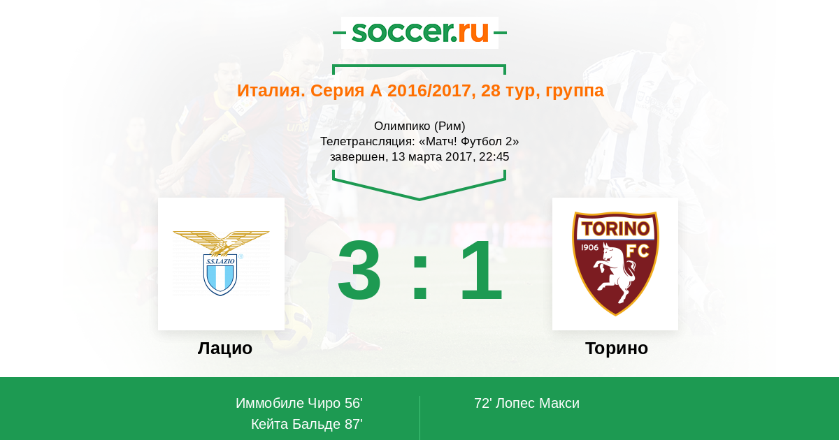 Все! Матч завершен! Римскому "Лацио" удалось во втором тайме воплотить свое игровое преимущество в забитые голы! Благодаря победе над "Торино" римляне поднимаются на четвертое место в турнирной таблице чемпионата Италии, опережая миланский "Интер" на два очка. Предлагаем Вам выбрать лучших игроков этого матча в составах обеих команд. Для Вас прямую онлайн-трансляцию этого матча провел Андрей Бабенчук. До новых встреч на https://www.soccer.ru/ !