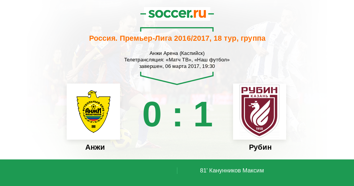 Все! Матч завершен! "Рубин" добывает на выезде минимальную победу над "Анжи" со счетом 1:0 благодаря шикарному голу Максима Канунникова в стиле Роббена! Махачкалинцы демонстрировали неплохой рисунок игры, создавали моменты, но после удаления Саида Эзатолахи "рубиновые" перехватили инициативу и забили победный гол. Предлагаем Вам выбрать лучших игроков этого матча в составах обеих команд. Для Вас прямую онлайн-трансляцию этого матча провел Андрей Бабенчук. Оставайтесь на https://www.soccer.ru/ !