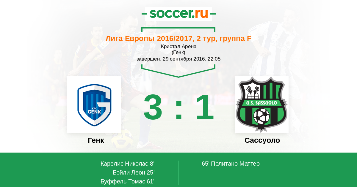 Nikolaos Карелис (Генк) из многообещающей позиции бьет мимо ворот. Целил в правый угол, но не хватило нескольких сантиметров. Мяч покинул пределы поля. Сассуоло введет мяч в игру ударом от ворот.