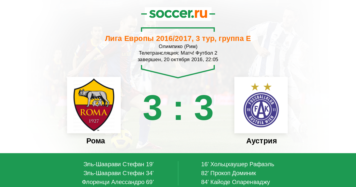 Невероятный по развязке получился поединок на "Стадио Олимпико". До 80 минуты казалось, что "Рома" доведёт матч до логического завершения, однако гости из Австрии с таким мнением были не согласны и вырвали важную для себя ничью. Команды заработали по одному очку и остаются лидерами квартета "Е" несмотря на исход параллельной игры ("Виктория Пльзень" 1:2 "Астра"). Уважаемые пользователи, вы можете оценить действия футболистов и выбрать лучших в каждом из коллективов. Текстовую онлайн-трансляцию провёл Глеб Васильев. Следите за футболом вместе с "Соккер.Ру"!