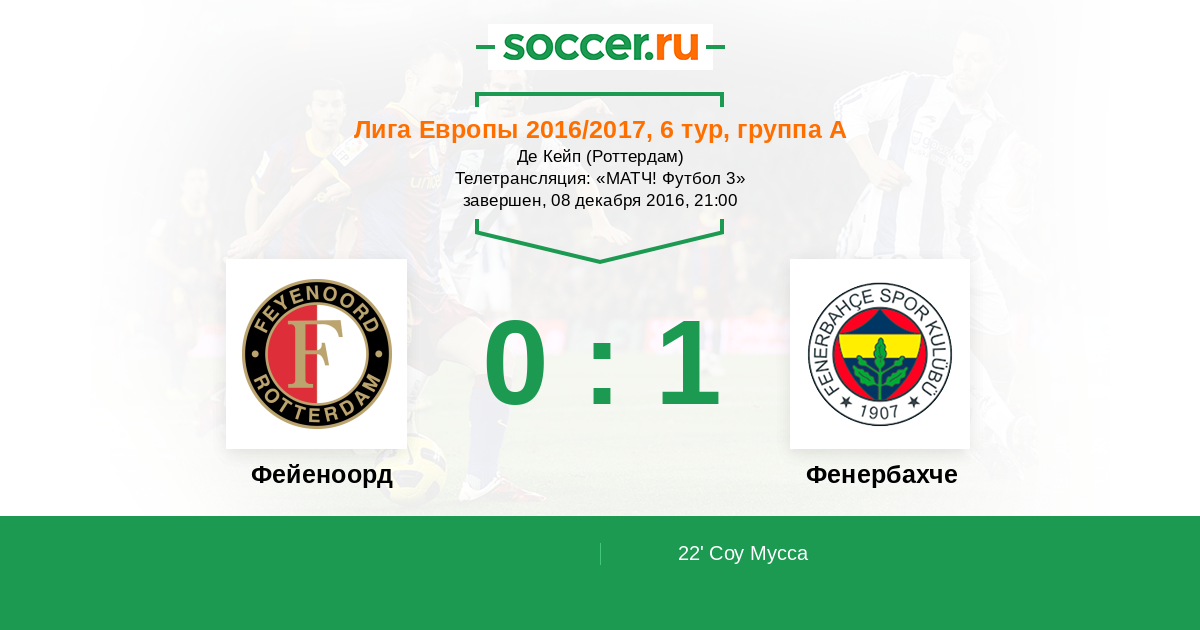Добрый вечер, уважаемые любители футбола! Вслед за последним в этом году туром Лиги Чемпионов подходит очередь решающих игр во втором по значимости клубном турнире Европы. Сегодня определятся все участники 1/16 финала Лиги Европы. В группе A сохраняют шансы на выход три команды, остановимся подробнее на матче между голландским "Фейеноордом" и турецким "Фенербахче". Расклад перед последним туром следующий, команде Джованни ван Бронхорсту для выхода в плей-офф нужно сегодня побеждать у "желтых канареек" с разницей в два мяча, только в этом случае "Фейеноорд" обойдет "Фенербахче" в турнирной таблице квартета под литерой A. На самом деле есть еще один вариант для выхода голландской команды в плей-офф, победа с разницей в один мяч и проигрыш "Манчестер Юнайтед" в матче против "Зари". Подопечным Дика Адвоката для выхода в 1/16 финала Лиги Европы достаточно сегодня не проиграть больше чем в один мяч. Наименьшие шансы на выход у "Фейеноорда", который постарается приложить максимум усилий для того, чтобы пробиться в следующую стадию турнира. Вместе с Вами следить за событиями этого увлекательного матча на soccer.ru будет Дмитрий Отмахов.