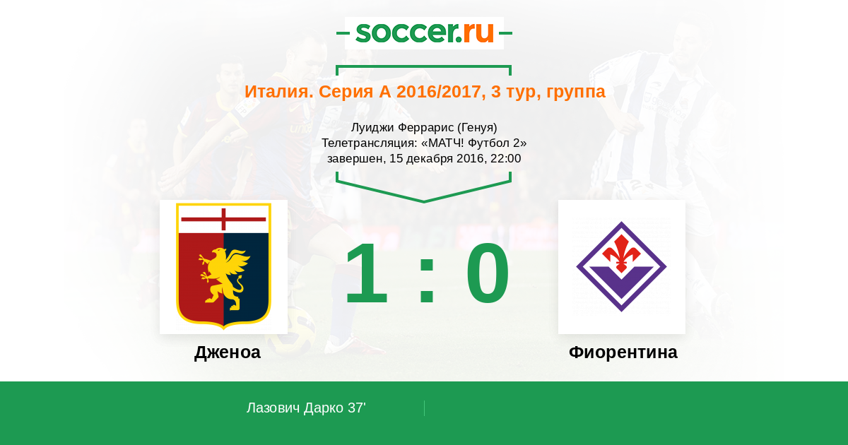 Добрый вечер, уважаемые любители футбола! Сегодня будет доигран матч третьего тура итальянской Серии A, "Дженоа" - "Фиорентина". Напомним, что игра была прервана на 28 минуте из-за сильного дождя, который обрушился на Геную одиннадцатого сентября. На данный момент команды, имея игру в запасе, расположились ближе к середине турнирной таблицы, "фиалки" занимают седьмое место, а "грифоны" тринадцатое. Оба клуба не прочь за счет сегодняшнего матча поправить свое турнирное положение, так что обе команды будут настраиваться на победу. В прошлом сезоне подопечным Паулу Соузы удалось в домашнем матче выиграть у "Дженоа" с минимальным счетом, а ответная игра в Генуе завершилась без забитых мячей. Посмотрим сколько мячей смогут забить команды сегодня за оставшиеся 62 минуты игрового времени! Вместе с Вами следить за событиями этого матча на soccer.ru будет Дмитрий Отмахов.