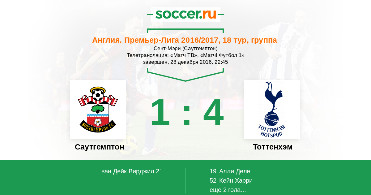 Прозвучал финальный свисток Майка Дина! 1:4 - с таким счётом "шпоры" разгромили "святых". Во втором тайме лондонцы сумели отправить в сетку ворот Бена Форстера три безответных мяча. В итоге дубль записал на свой лицевой счёт Деле Алли, ещё по одному голу забили Сон и Кейн. Последний, кстати, ещё не забил пенальти на исходе часа игры. В составе хозяев в самом начале матча отличился Ван Дейк. Таким образом, "шпоры" продолжают лидирующую четвёрку - теперь команда Маурисио Почеттино отстаёт от "Арсенала" на один балл. "Саутгемптон" упустил возможность приблизиться к еврокубковой зоне - "святые" по прежнему на восьмой строчке. На этом всё. С вами был Олег Олезов. Вы можете выбрать лучших игроков матча. Спасибо за внимание и до новых встреч на https://www.soccer.ru! С наступающим Новым годом, дорогие друзья!