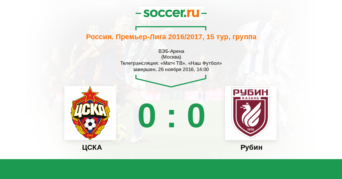 Не увидели забитых мячей зрители на трибунах "Арены ЦСКА", но матч получился интересным и напряженным до последних минут. Хорошую игру продемонстрировали команды в обороне, но не обошлось и без везения в некоторых моментах. "ЦСКА" набирает 26 очков и ждет матчей "Терека" и "Краснодара", которые могут чуть позже сместить москвичей с третьей строчки. Для "Рубина" выездную ничью с "армейцами" можно назвать успешной, команда не проигрывает уже в 4 последних матчах подряд. Вы можете определить лучших игроков встречи на Ваш взгляд. Текстовую онлайн-трансляцию вел Роман Земко. Впереди еще много интересного футбола, оставайтесь на "Соккер.ру"!