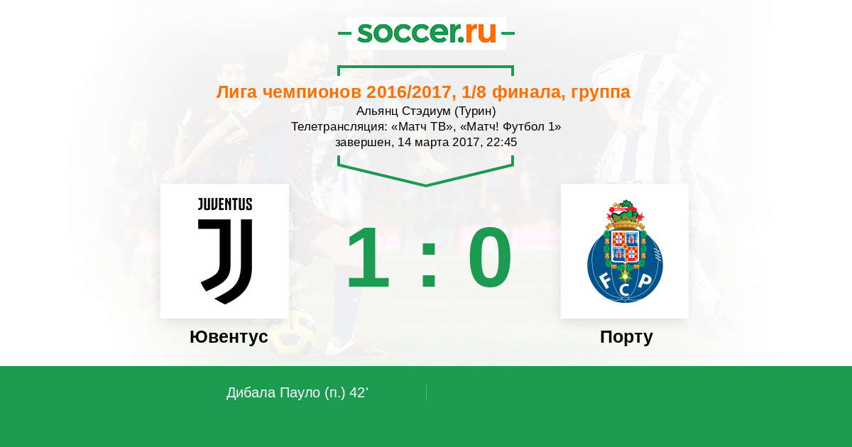 Не испытал туринский "Ювентус" и в ответном матче проблем с "Порту", одержав с минимальным счетом домашнюю победу над "драконами" и оформив себе путевку в 1/4 финала самого престижного турнира Старого Света. Единственный гол в составе "бьянконери" с пенальти забил Пауло Дибала в самой концовке первого тайма. Мы предлагаем Вам определить лучших игроков матча на Ваш взгляд. Текстовую онлайн-трансляцию вел Роман Земко. Всего доброго! До новых встреч на "Соккер.ру"!