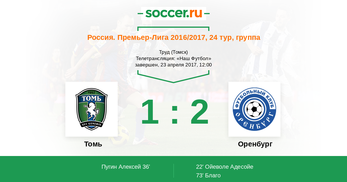Все! Матч завершен! В зрелищном поединке "Оренбург" одержал победу над "Томью" со счетом 2:1! Открыли счет гости в середине первого тайма, но томичи еще до перерыва сравняли счет. Подарил победу "Оренбургу" Благо, который красивым ударом со штрафного установил окончательный счет на табло! Трудовые три очка для "Оренбурга"! Предлагаем Вам выбрать лучших игроков в составах обеих команд. Для Вас прямую онлайн-трансляцию этого матча провел Андрей Бабенчук. Оставайтесь на https://www.soccer.ru/!