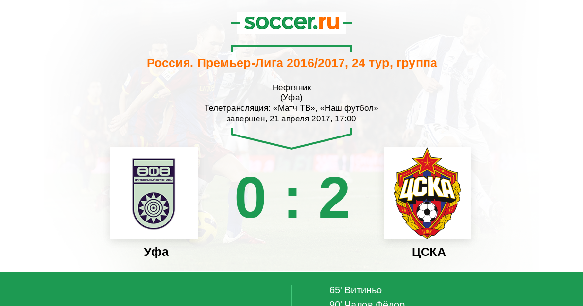 Всё! Игорь Акинфеев выбивает мяч к центру поля, и раздаётся финальный свисток Владислава Безбородова! Одержали красно-синие уверенную по счёту победу-0:2. Отличились после перерыва Витиньо и Фёдор Чалов. При этом, например, забей в начале второго тайма пенальти Пауревич, и, кто знает, смогли бы увезти 3 очка из Уфы "армейцы". Добротный матч провели хозяева поля, но свои подходы к ворота Акинфеева они не реализовали, а вот ЦСКА, напротив, наконец-то разразился сразу двумя голами. На выезде с красно-синим клубом это произошло лишь во второй раз в сезоне. На этом всё. ЦСКА продолжает борьбу за чемпионство и попадание в Лигу Чемпионов, а "Уфа" остаётся в середине турнирной таблицы. С вами был Олег Олезов. Вы можете выбрать лучших игроков матча. Спасибо за внимание и до новых встреч на https://www.soccer.ru!
