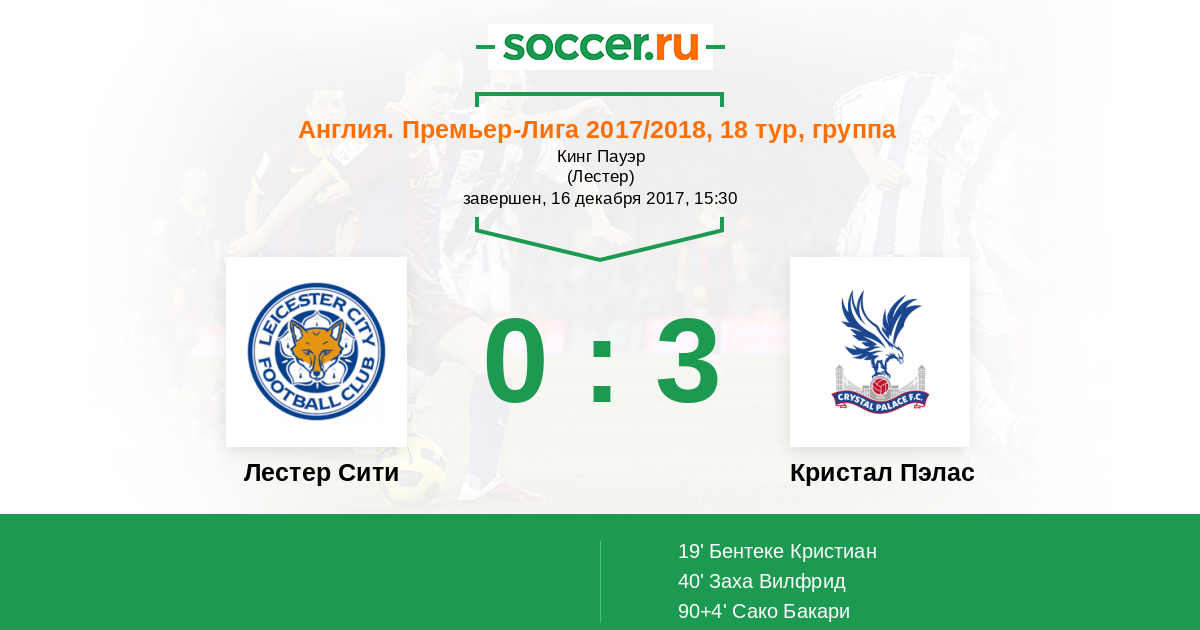 Уилфрид Заа (Кристал Пэлас) отличный проход совершил и нанес удар в нижний левый угол ворот, Каспер Шмейхель был бессилен. Он меняет счет - 0:2.