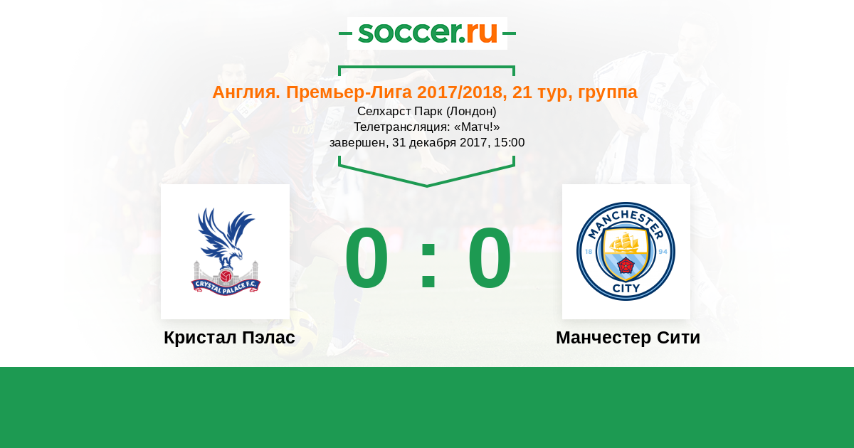 Доброго времени суток, уважаемые любители футбола! Рады приветствовать Вас на текстовой онлайн-трансляции поединка двадцать первого тура АПЛ, в котором "Кристал Пэлас" примет "Манчестер Сити". Встреча пройдет на стадионе "Селхарст Парк" в Лондоне, а рассудит команды бригада арбитров во главе с Джонатаном Моссом.