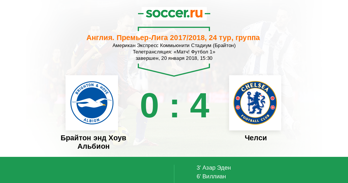 Все! Матч завершен! "Челси" одержал уверенную выездную победу над "Брайтоном" со счетом 4:0. Дублем отметился Эден Азар, еще по одному голу забили Виллиан и Мозес. Для Вас прямую онлайн-трансляцию этого поединка провел Андрей Бабенчук. Оставайтесь на https://www.soccer.ru/!
