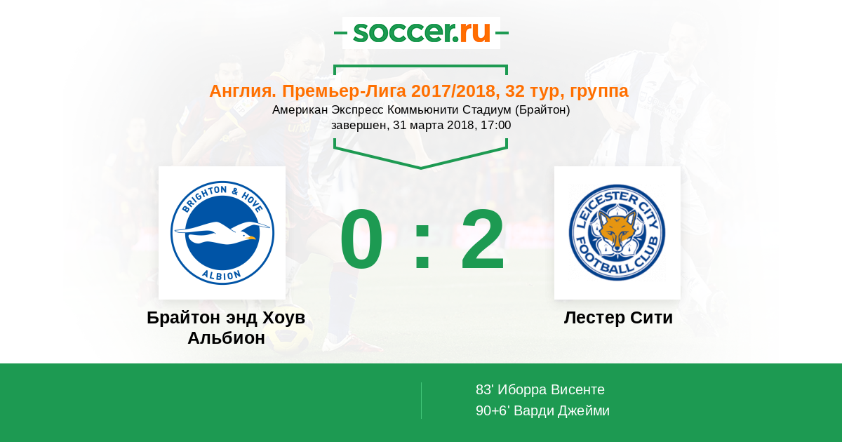 Джейми Варди (Лестер Сити) получил мяч в штрафной после навеса и быстро пробил в угол ворот. Мэттью Райан сохранил свои ворота в неприкосновенности.
