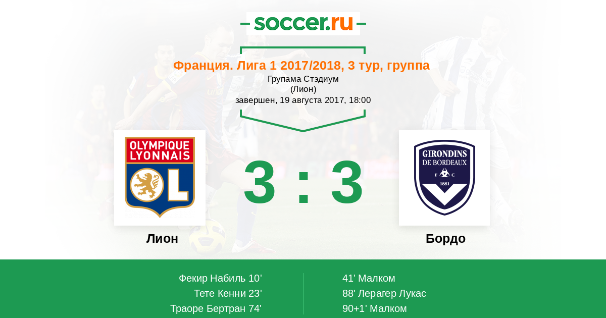 Франсуа Камано (Бордо) подал его, но в штрафной уверенно сыграла защита. Мяч выбит. Мяч ушел за линию ворот, и вратарь команды Лион произведет удар от ворот.