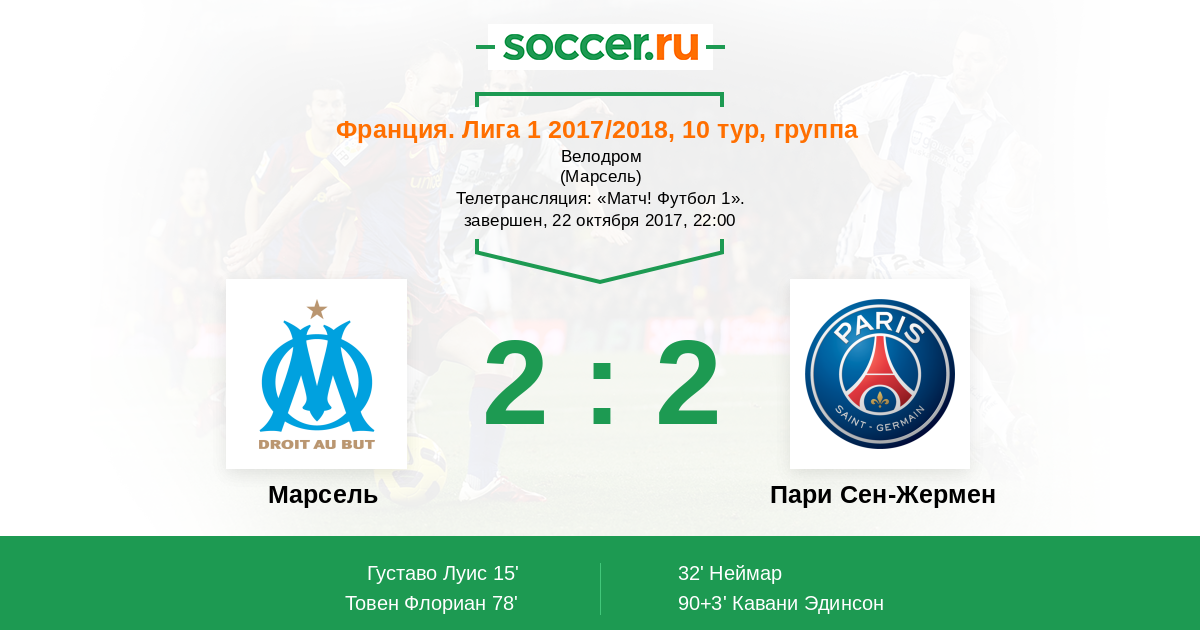 Добрый вечер, уважаемые поклонники футбола! Десятый тур французской Лиги 1 закроет центральный его матч - "Марсель" примет ПСЖ. Команды являются очень принципиальными соперниками, а потому на стадионе "Велодром" зрителей ожидает жаркая борьба. Парижане являются фаворитами предстоящего поединка, но Руди Гарсия готовит своих подопечных к тому, чтобы дать бой гранду и набрать очки. Одержат ли гости очередную победу в чемпионате? Сайт https://www.soccer.ru проведёт прямую текстовую онлайн трансляцию матча, следить за событиями на поле и комментировать игру для вас будет Старчеус Сергей.