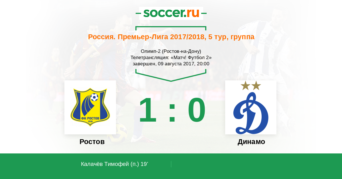 Добрый вечер всем любителям футбола! Рады приветствовать Вас на матче 5-го тура российской Премьер-лиги, в котором на стадионе "Олимп-2" сыграют "Ростов" Леонида Кучука и московское "Динамо" Юрия Калитвинцева. Для Вас прямую онлайн-трансляцию этого поединка проведет Андрей Бабенчук.