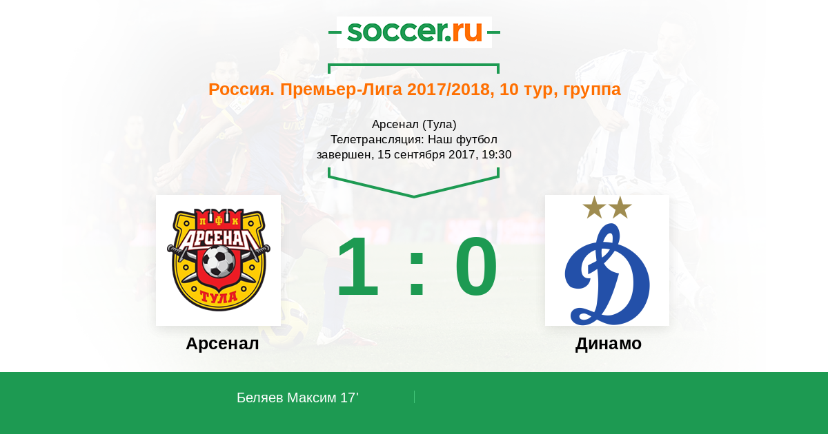 Приветствуем всех любителей российского футбола на «Соккер.Ру»! Мы с вами отправляемся в Тулу, где «Арсенал» будет принимать «Динамо» в рамках 10-ого тура РФПЛ. Главным арбитром на данную встречу назначен Михаил Вилков – рефери из Нижнего Новгорода. Текстовую онлайн-трансляцию проведет Глеб Васильев. Начинаем в 19:30!