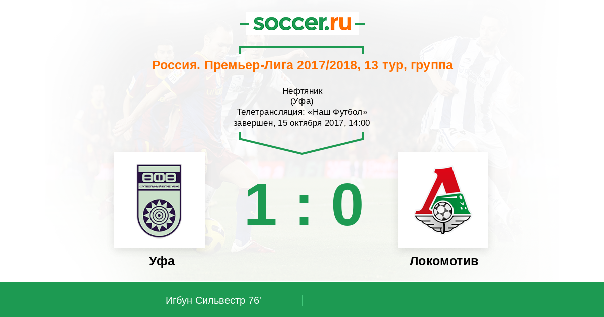 Доброго времени суток, уважаемые любители футбола! Рады приветствовать Вас на текстовой онлайн-трансляции поединка 13-го тура РФПЛ, в котором "Уфа" примет "Локомотив". Команда Сергея Семака имеет в своем активе четырнадцать пунктов и занимает девятое место. "Железнодорожники", в свою очередь, набрали двадцать шесть баллов и располагаются на второй строчке.