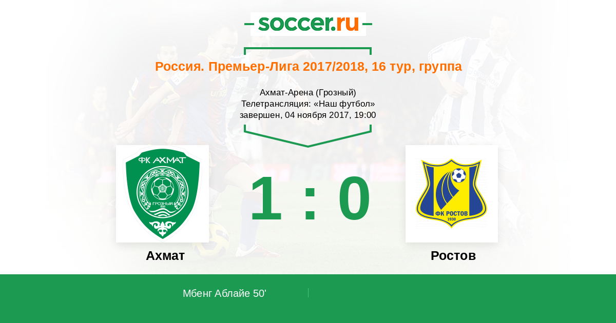 "Ахмат" добивается важной победы в первом матче под руководством Михаила Галактионова. Единственный гол в матче был забит в начале второго тайма, Аблайе Мбенге после подачи партнера отправил мяч ударом головой в сетку ворот соперника. Футболисты "Ростова" отыграться не смогли! Предлагаем выбрать лучших игроков в составах команд, комментировал для вас Дмитрий Отмахов. До новых встреч на soccer.ru.