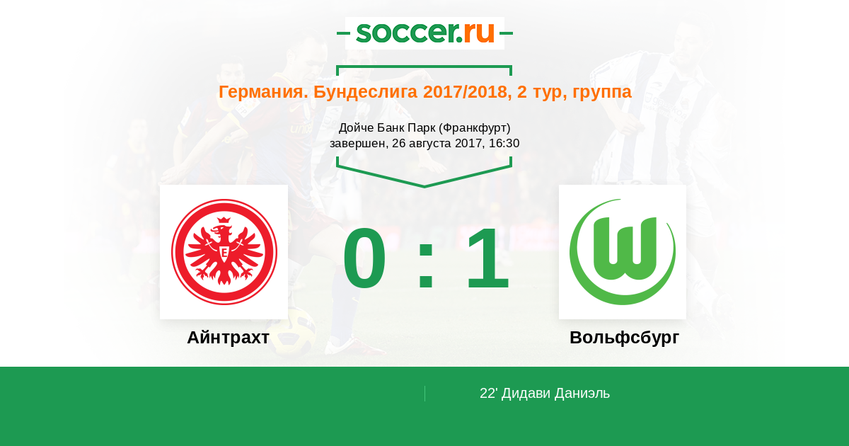Угловой, команда Вольфсбург разыграла навесом, который был слишком сильным и улетел за пределы поля. Мяч покинул пределы поля. Айнтрахт Ф введет мяч в игру ударом от ворот.