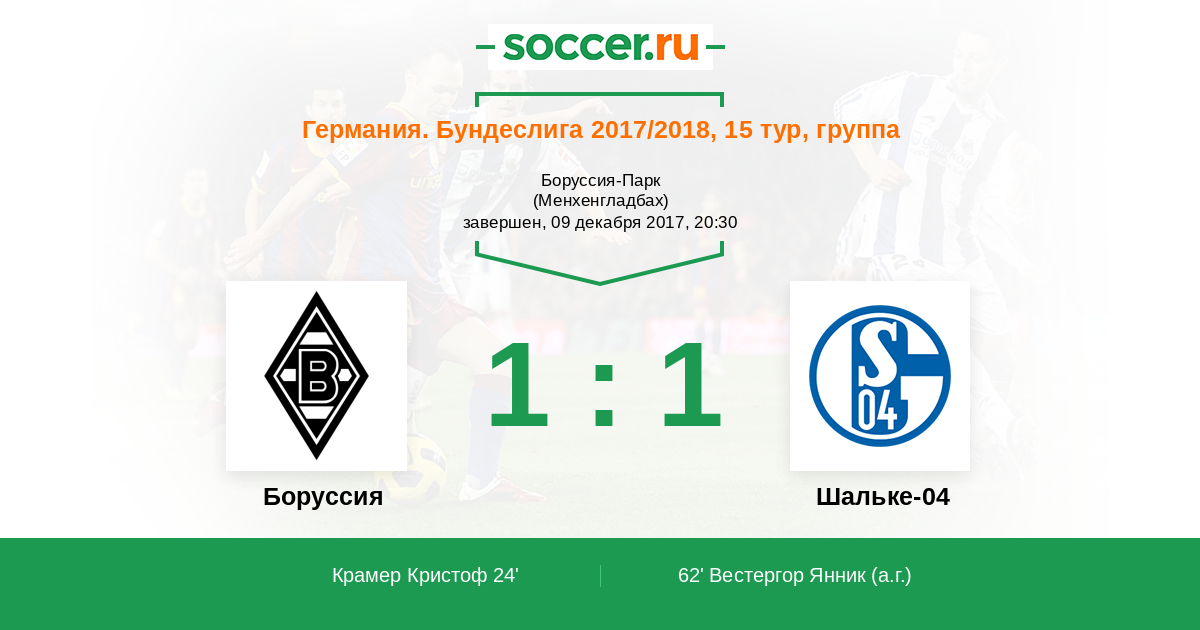 ГООООЛ! Кристоф Крамер (Боруссия Мёнхенгладбах) забивает головой после того, как Маттиас Гинтер скинул ему мяч. Счет 1:0.