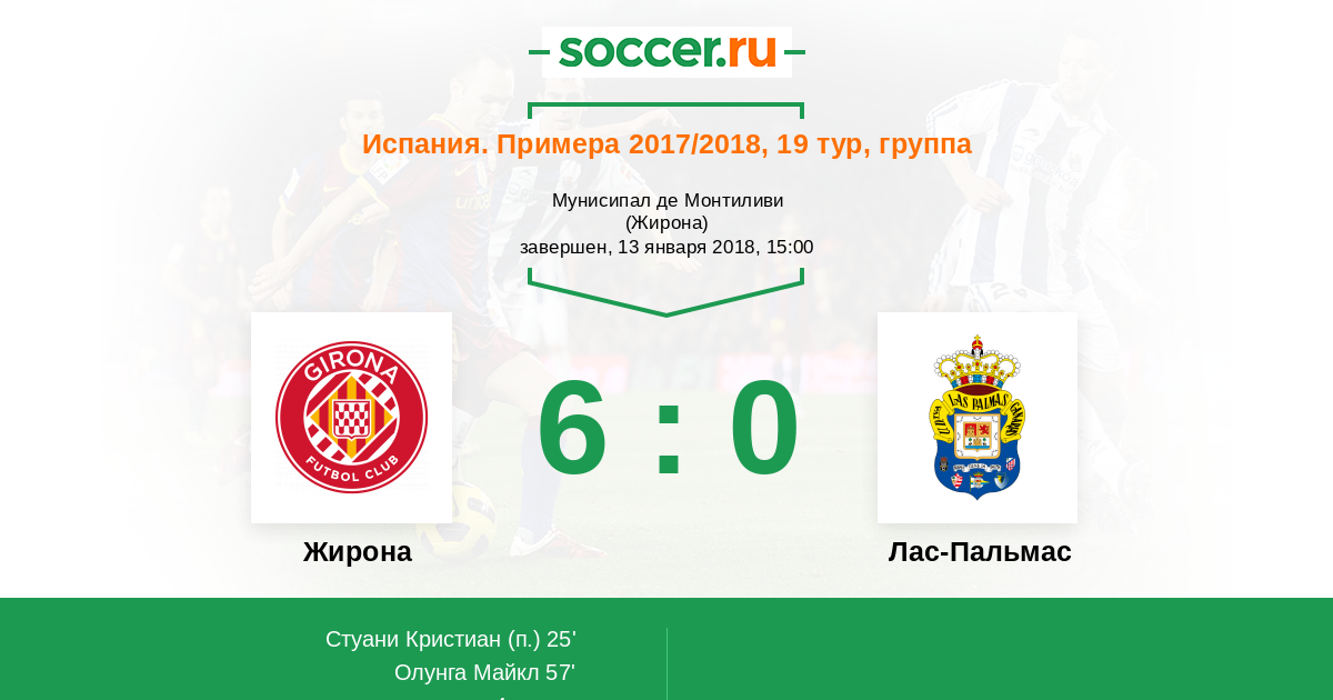 Габриэль Penalba (Лас-Пальмас) исполнял опасную передачу, но слишком сильно запустил мяч. Опасного момента не вышло. Жирона произведет вбрасывание, об этом сигнализируют главный судья и его помощник.
