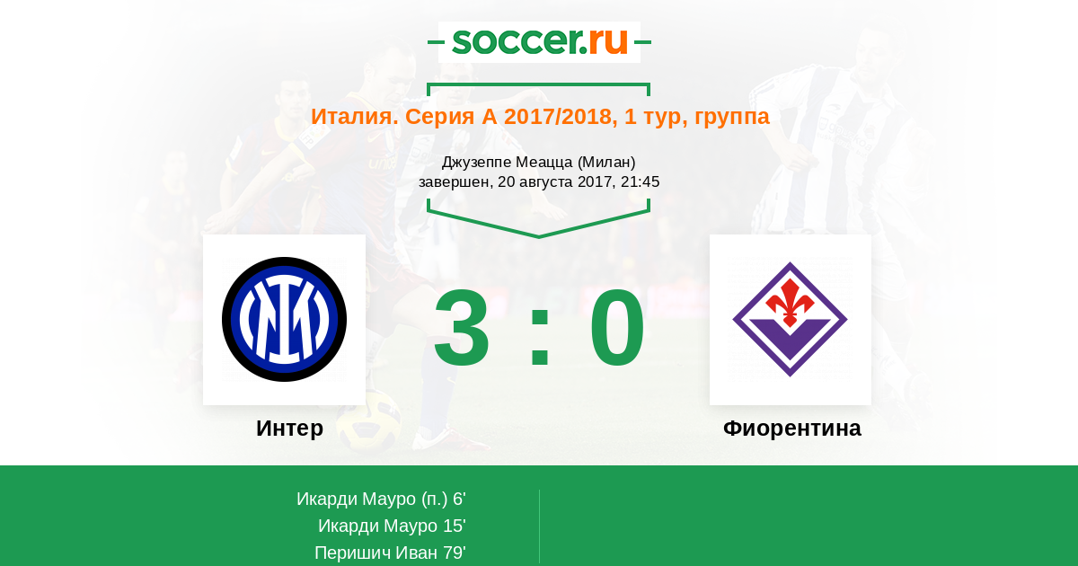 Иван Перишич делает отличный пас, но Матиас Вечино (Интер) не смог точно пробить - чудь правее штанги. Мяч покинул пределы поля. Фиорентина введет мяч в игру ударом от ворот.