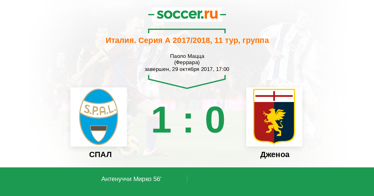 Mirco Antenucci (СПАЛ) пробил первым касанием с 20 метров. Маттиа Перин вытянулся в струнку, но не отбил мяч, летевший в нижний угол ворот.