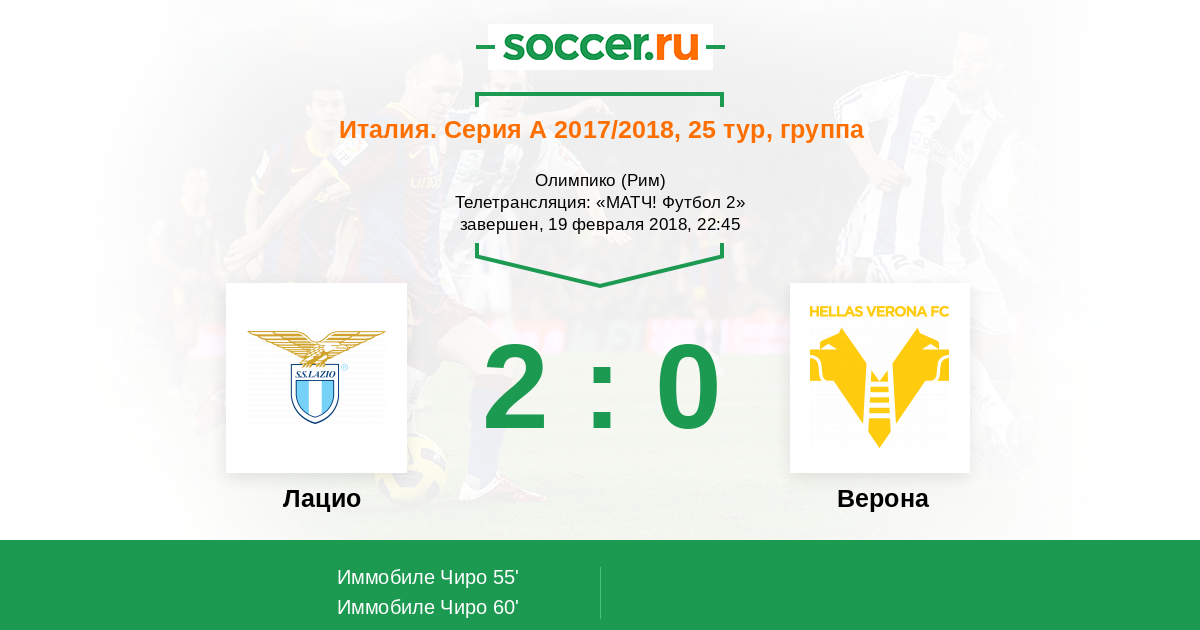 Добрый вечер всем любителям футбола! Рады приветствовать Вас на матче 25-го тура итальянской Серии А, в котором на стадионе "Олимпико" в Риме сыграют "Лацио" и "Верона". Для Вас прямую текстовую онлайн-трансляцию этого поединка проведет Андрей Бабенчук.