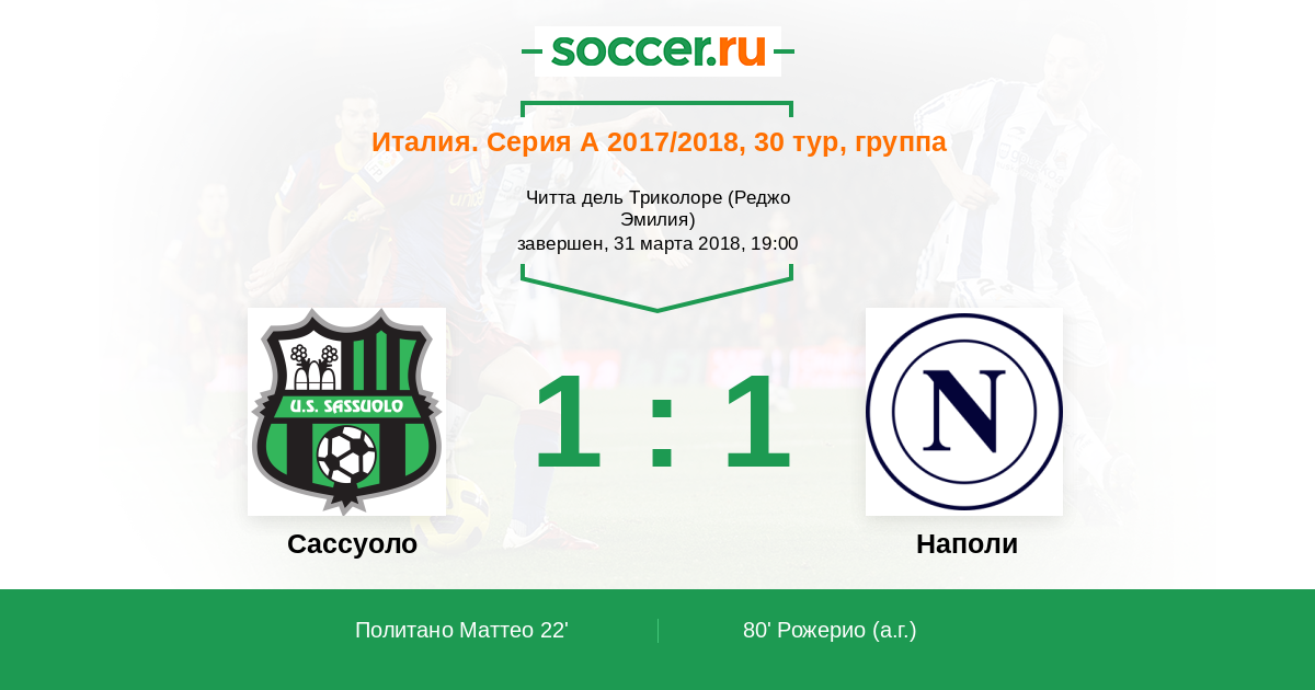 Обидно свои ворота поразил Рожерио (Сассуоло). Он хотел прервать прострел, но получился автогол. Точно в правый угол, вратарю было не достать.