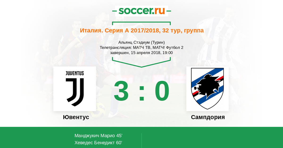 Деннис Прат (Сампдория) пытается прокинуть мяч сквозь защиту, но он не смог найти своим пасом одноклубников. Мяч покинул пределы поля. Ювентус введет мяч в игру ударом от ворот.