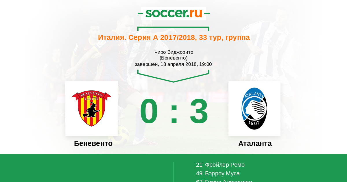 Ремо Фройлер (Аталанта) посылает длинный пас. Его не получает Hans Хатебур, так как мяч был послан слишком сильно. Мяч ушел за линию ворот, и вратарь команды Беневенто произведет удар от ворот.