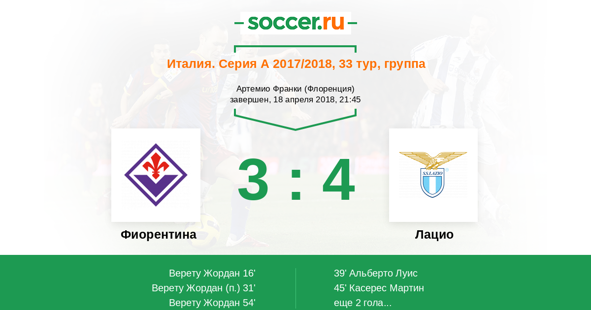 Джордан Верету (Фиорентина) отличный проход совершил и нанес удар в нижний правый угол ворот, Томас Стракоша был бессилен. Он меняет счет - 3:2.