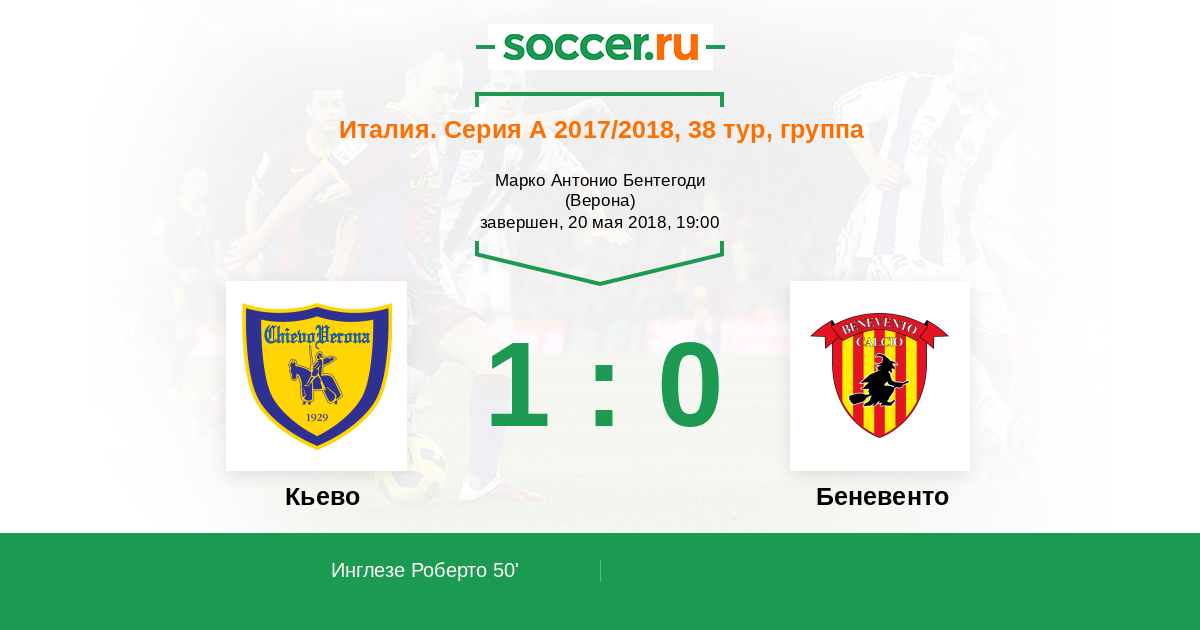 Энрико Brignola (Беневенто) нанес первый удар, который был заблокирован, нанес второй удар, но и так не смог забить. Его выстрел идет чуть мимо левой штанги. Мяч покинул пределы поля. Кьево введет мяч в игру ударом от ворот.