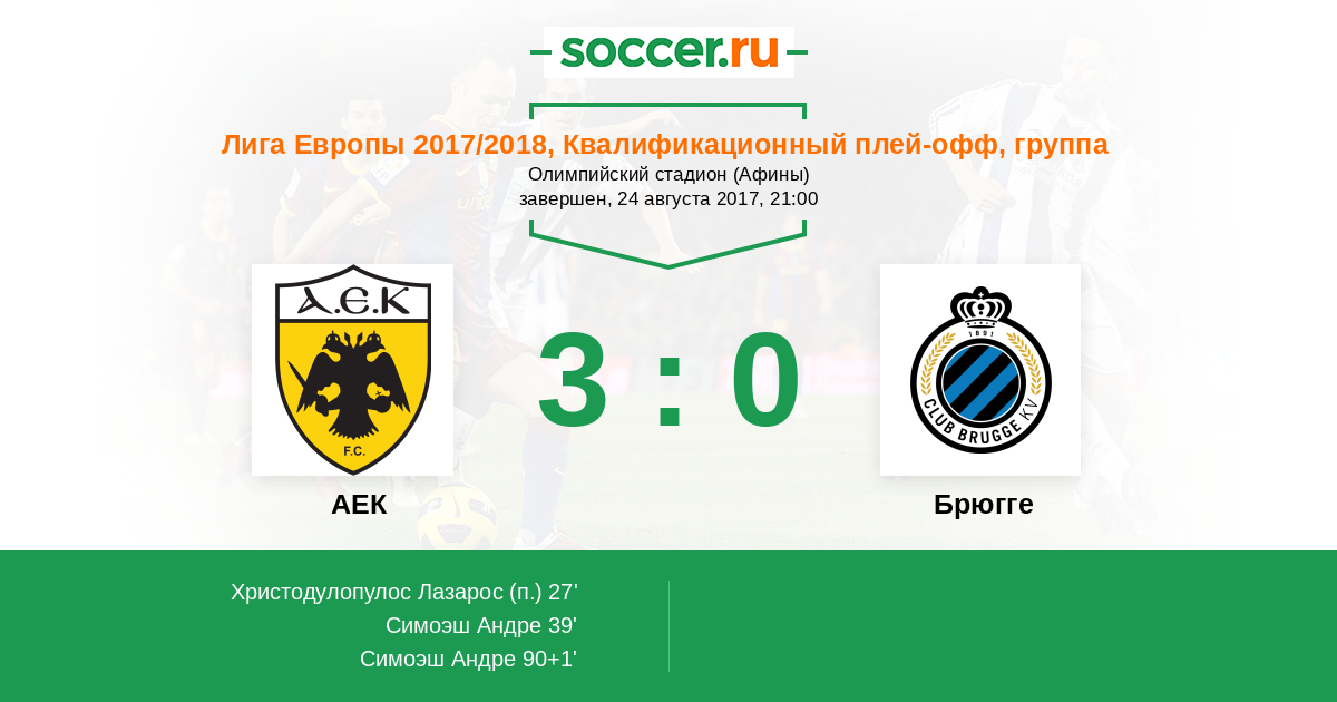 Андре Симоэш (AEK) получил отскок во вратарской и нанес удар головой. Счет стал 2:0, после того как мяч оказался в сетке по центру ворот.