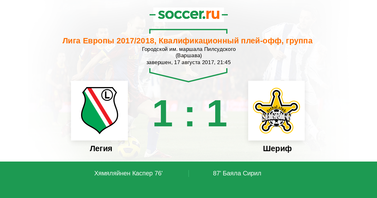 Cyrille Bayala (Шерифф) перепрыгнул всю оборону и из пределов вратарской нанес точный удар головой в левый угол ворот. У голкипера не было шансов среагировать. Счет 1:1.