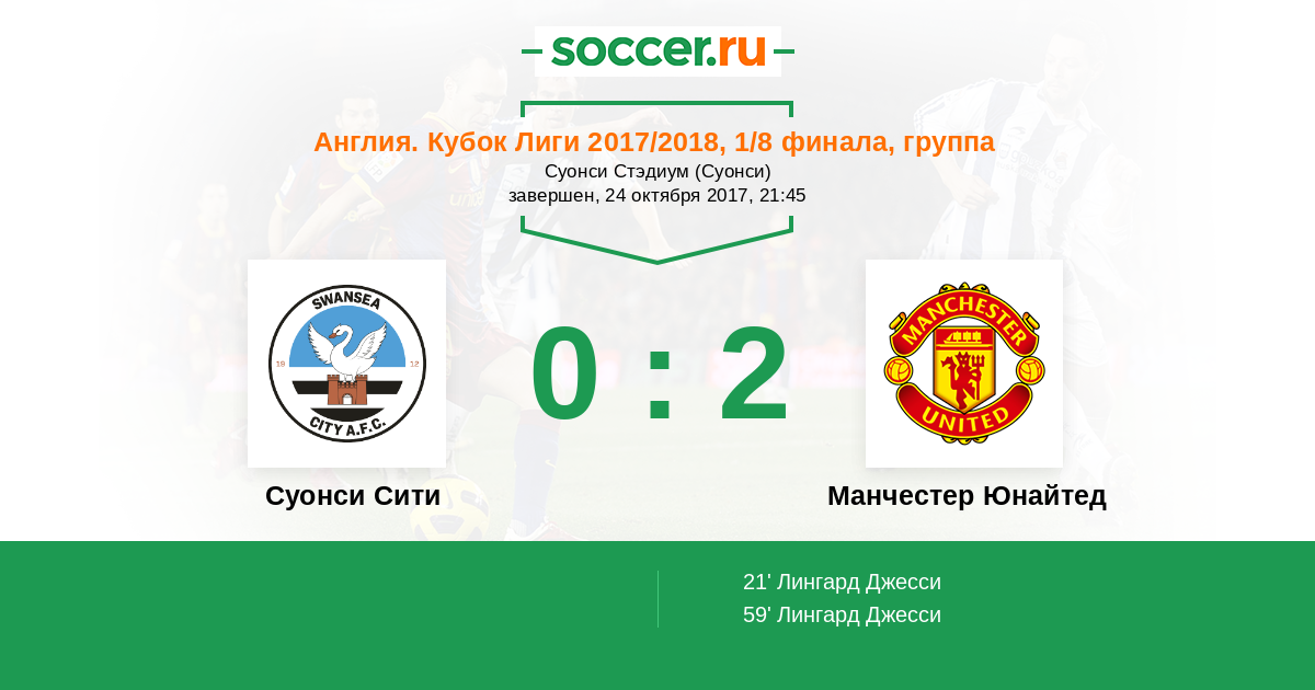 Добрый день, уважаемые любители футбола! Рады приветствовать Вас на матче 1/8 финала Кубка английской лиги, в котором лицом к лицу сойдутся «Суонси» и «Манчестер Юнайтед». Данная встреча пройдёт на стадионе «Либерти» и начнётся в 21:45 по Москве. Обслуживать матч будет бригада арбитров во главе с Робертом Мэдли - рефери из Йоркшира. Текстовую онлайн-трансляцию проведёт Глеб Васильев. Не пропустите!