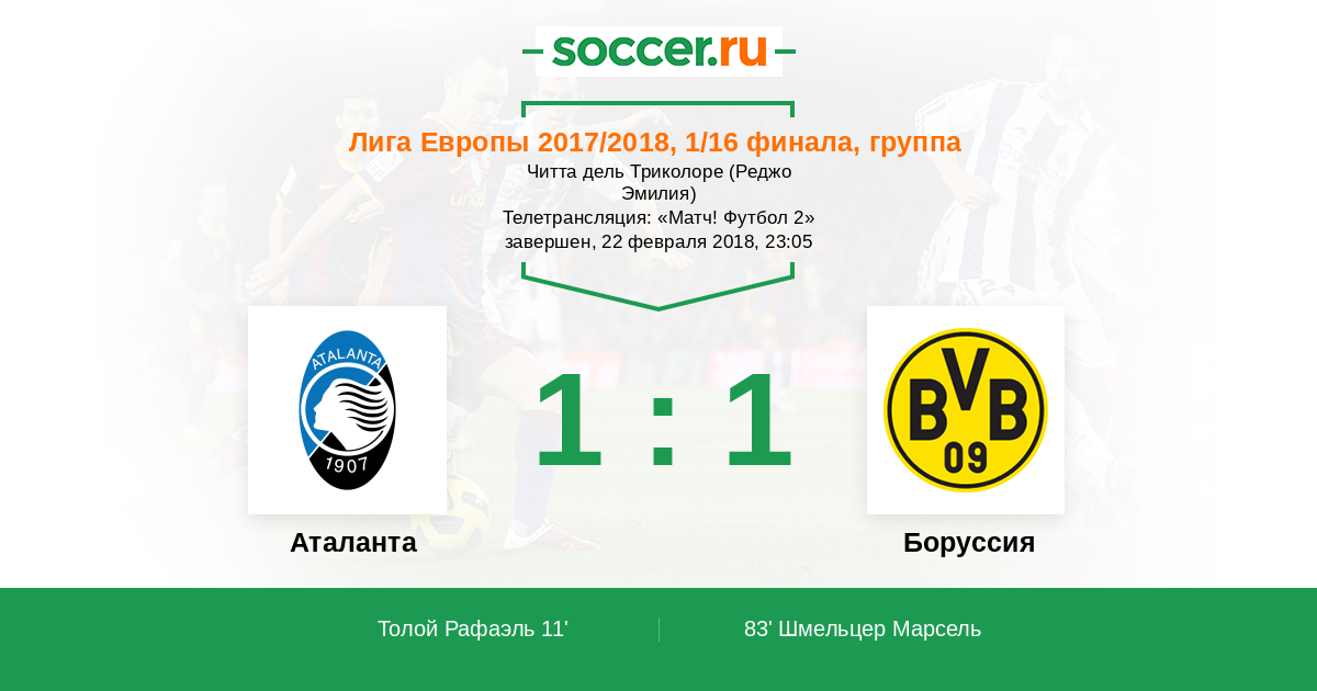 Все! Матч завершен! Дортмундская "Боруссия" расписала на выезде ничью с "Аталантой" со счетом 1:1. Благодаря ничейному результату "шмели" прошли в 1/8 финала Лиги Европы. "Аталанте" удалось забить быстрый гол усилиями Рафаэля Толоя, а пропустили бергамаски уже под конец встречи - Марсель Шмельцер подарил команде путевку в 1/8 финала. Для Вас прямую онлайн-трансляцию этого поединка провел Андрей Бабенчук. Оставайтесь на https://www.soccer.ru/!