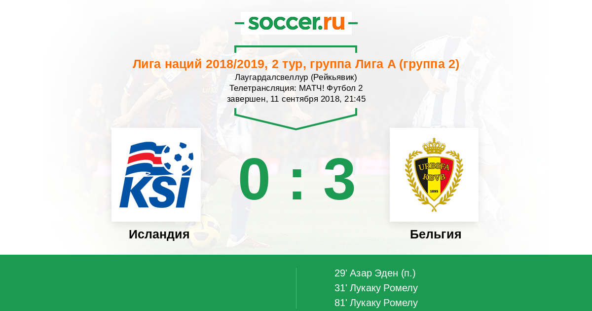 Вот и всё! Сборная Бельгии в энергосберегающем режиме добилась разгромной победы в Рейкьявике. Отличный дебют в Лиге наций УЕФА, чего не скажешь о "викингах", которые вновь потерпели крупное поражение. Текстовую онлайн-трансляцию провёл Глеб Васильев. Следите за Лигой наций на Soccer.Ru!