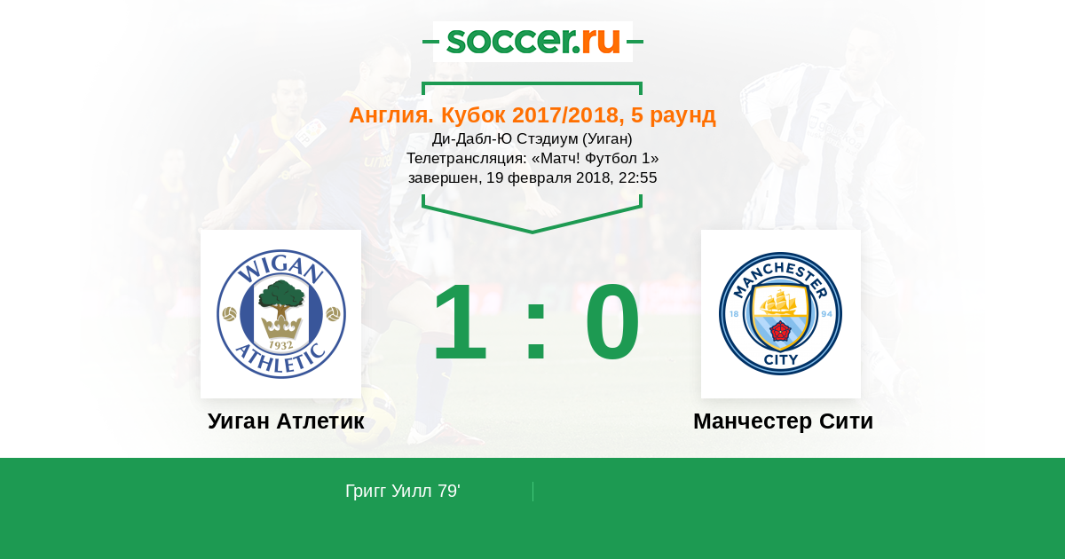 Will Grigg`s on Fire! Прозвучал финальный свисток, который зафиксировал маленькое чудо. Команда из третьего по силе дивизиона Англии смогла остановить грозный "Манчестер Сити". Уилл Григг записал на свой счет победный гол. Спасибо, что следили за развитием событий этого интереснейшего поединка вместе с "Соккер.ру".