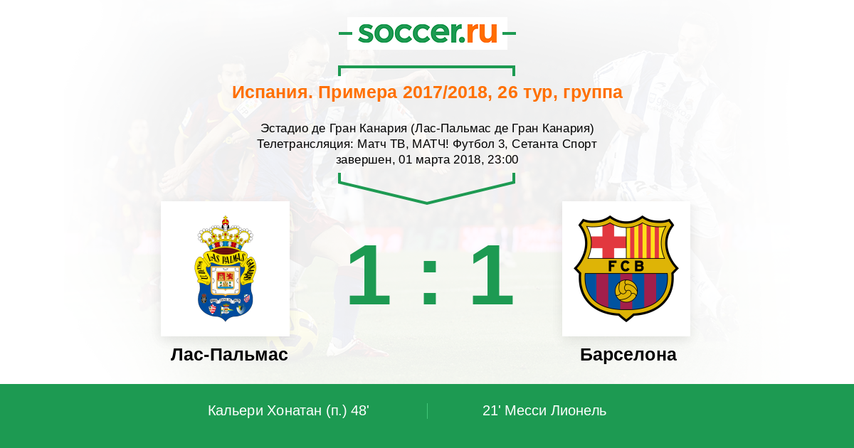 Приветствуем всех любителей европейского футбола! Мы с вами отправляемся на стадион «Гран-Канария», где уже сегодня вечером состоится одна из игр 26-го тура Примеры – «Лас-Пальмас» будет принимать лидера чемпионата «Барселону». Главным арбитром на данную встречу назначен Матеу Лаос. Встретимся в 23:00!