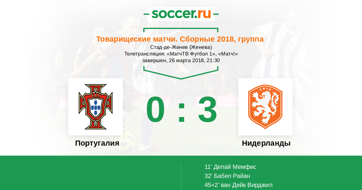 Доброго времени суток, уважаемые любители футбола! Приглашаем Вас на текстовую онлайн-трансляцию товарищеского поединка, в котором сборная Португалии сразится со сборной Нидерландов. Встреча пройдет в Женеве на стадионе "Стад-де-Женев".