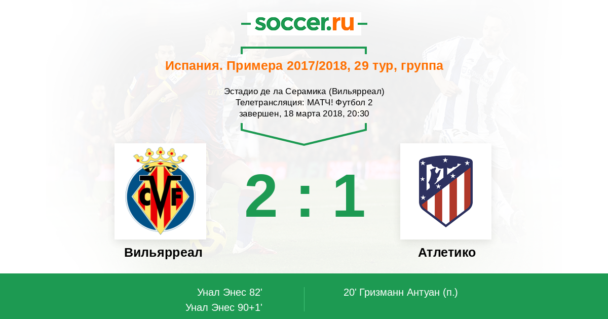Прострел и Антуан Гризманн (Атлетико) очень плохо пробивает по мячу. Выше ворот! Мяч покинул пределы поля. Вильярреал введет мяч в игру ударом от ворот.