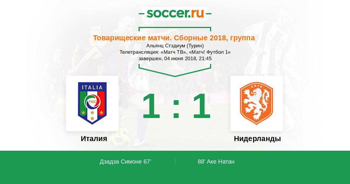 Все! Матч завершен! Сборная Италия в домашнем матче расписала ничью со сборной Нидерландов, голами отметились Симоне Дзадза и Натан Аке. Для Вас прямую онлайн-трансляцию этого поединка провел Андрей Бабенчук. Оставайтесь на https://www.soccer.ru/!