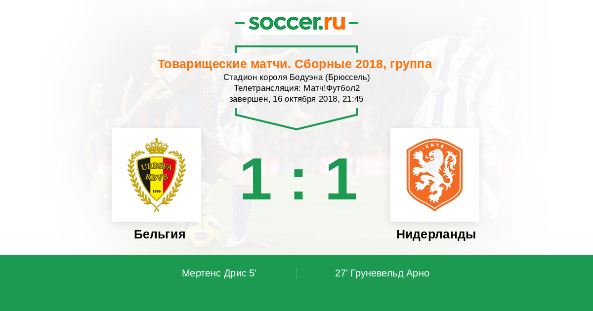 Доброго времени суток, уважаемые любители футбола! Рады приветствовать Вас на текстовой онлайн-трансляции товарищеского матча, в котором сборная Бельгии сыграет со сборной Нидерландов. Встреча пройдет в Брюсселе на стадионе "Король Бодуэн".