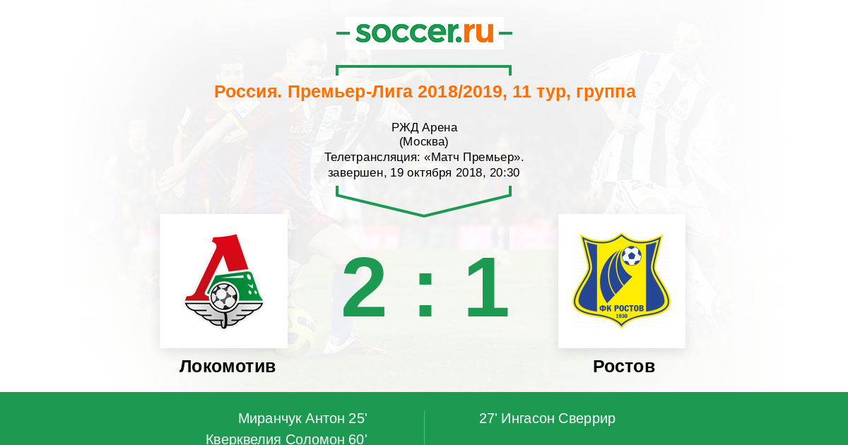 В результате этой победы, "Локомотив" вытесняет "Ростов" на пятое место, а сам поднимается на четвёртую строчку. Игра получилась напряжённой, здорово смотрелись оба коллектива. "Локомотив" смог добавить во втором тайме и в итоге это привело к забитому голу. "Ростов" пытался спасти игру, под конец матча много атаковал, но железнодорожники выстояли. Прямую текстовую онлайн трансляцию матча для вас провёл Старчеус Сергей, до новых встреч на https://www.soccer.ru !