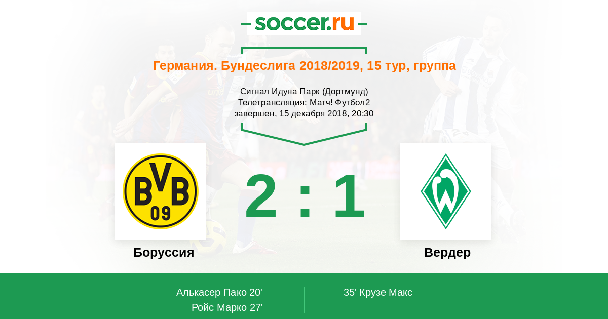 Доброго времени суток, уважаемые любители футбола! Рады приветствовать Вас на текстовой онлайн-трансляции матча пятнадцатого тура Бундеслиги, в котором дортмундская "Боруссия" сыграет с "Вердером". Встреча пройдет в Дортмунде на стадионе "Сигнал Идуна Парк". Обслужит матч бригада арбитров во главе с Гвидо Винкманн.
