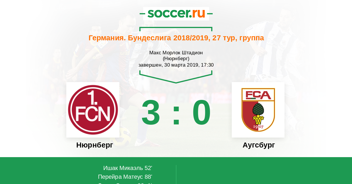 Мяч в сетке! Классное завершение момента, это был Matheus Перейра (Нюрнберг). Тим Лайбольд отправляет в штрафную отличный навес, после которого Matheus Перейра (Нюрнберг) отправляет мяч в нижний угол ворот с близкого расстояния. 3:0.
