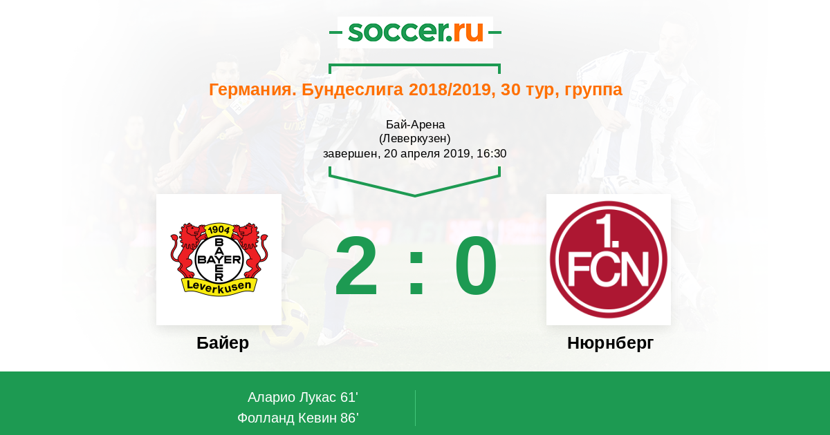 Кай Хаверц (Байер Леверкузен) сделал передачу, но ни один из его партнеров не достал до мяча. Мяч покинул пределы поля. Нюрнберг введет мяч в игру ударом от ворот.