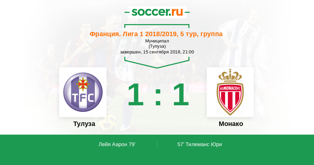 Юри Тилеманс (Монако) наносит удар с края штрафной, но не слишком точный - несколько метров выше перекладины. Мяч покинул пределы поля. Тулуза введет мяч в игру ударом от ворот.
