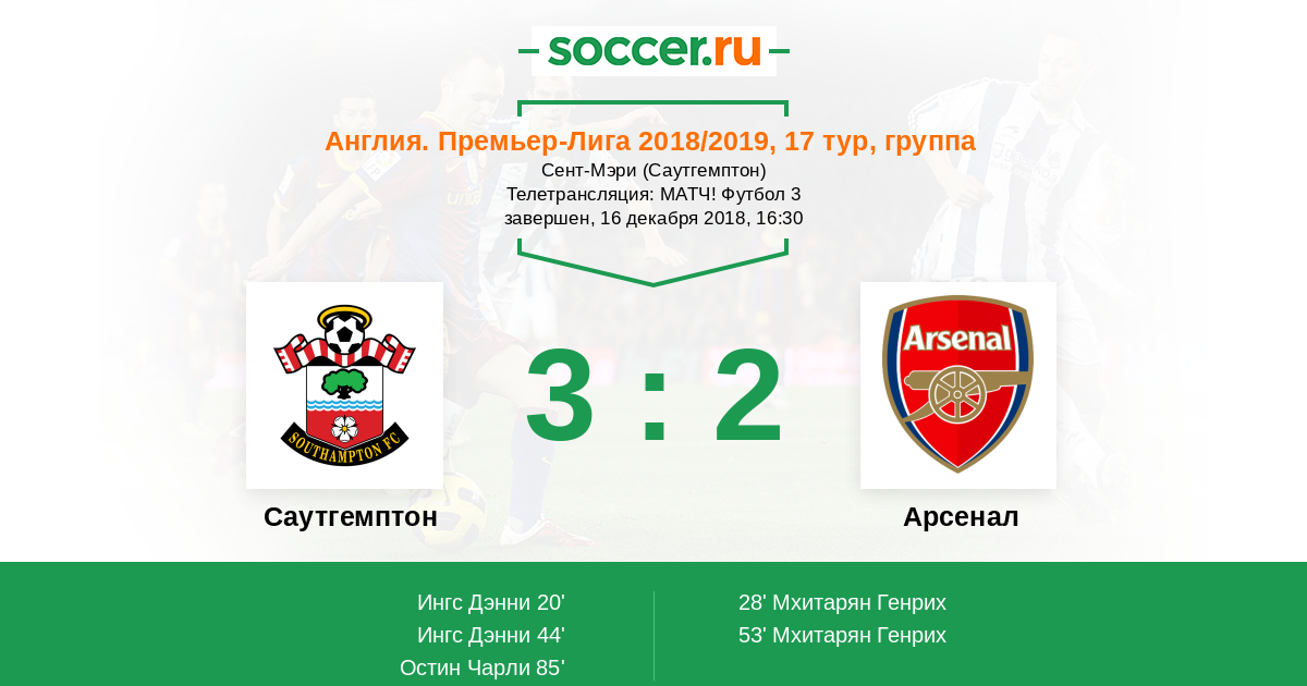 Приветствуем всех любителей английского футбола! Одним из матчей сегодняшнего игрового дня станет встреча «Саутгемптона» и «Арсенала». Главным арбитром на данный поединок назначен Крис Кавана – рефери из Ланкашира. Начинаем в 16:30!